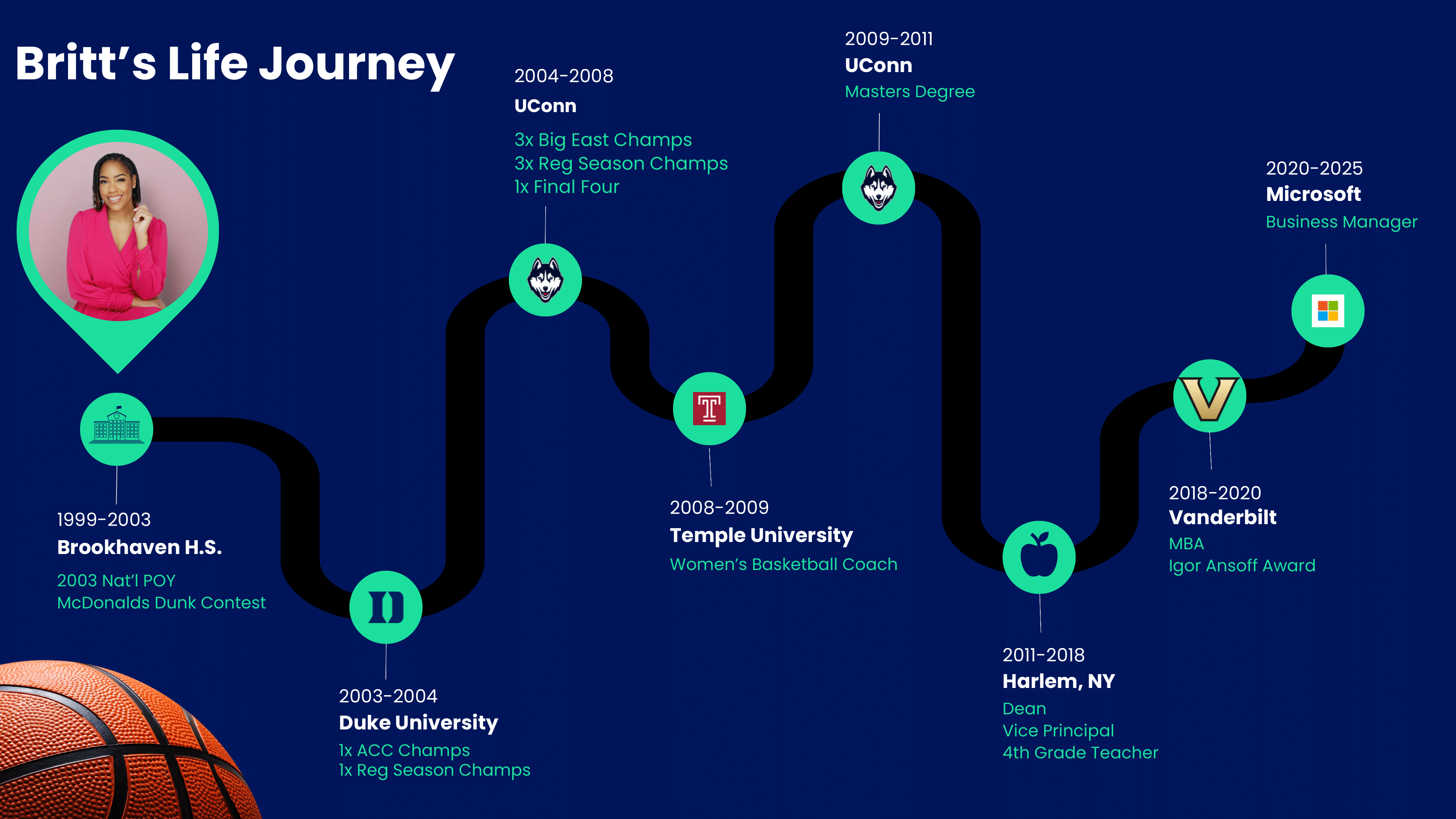 Brittany “Britt” Hunter is a dynamic speaker, leadership coach, and former top ranked athlete who empowers future leaders and changemakers through candid storytelling, engaging workshops, and executive coaching. After a devastating sports injury ended her basketball career at Duke and UConn, Britt pivoted to mentoring where she spent 7 years working in public education in Harlem as a Dean, Vice Principal, and 4th grade teacher. Before transitioning to the corporate world at Microsoft Britt earned an MBA from Vanderbilt. Now, she leverages her unique journey—marked by resilience, humor, and an unwavering commitment to leadership—to inspire others through Leadership Coaching.