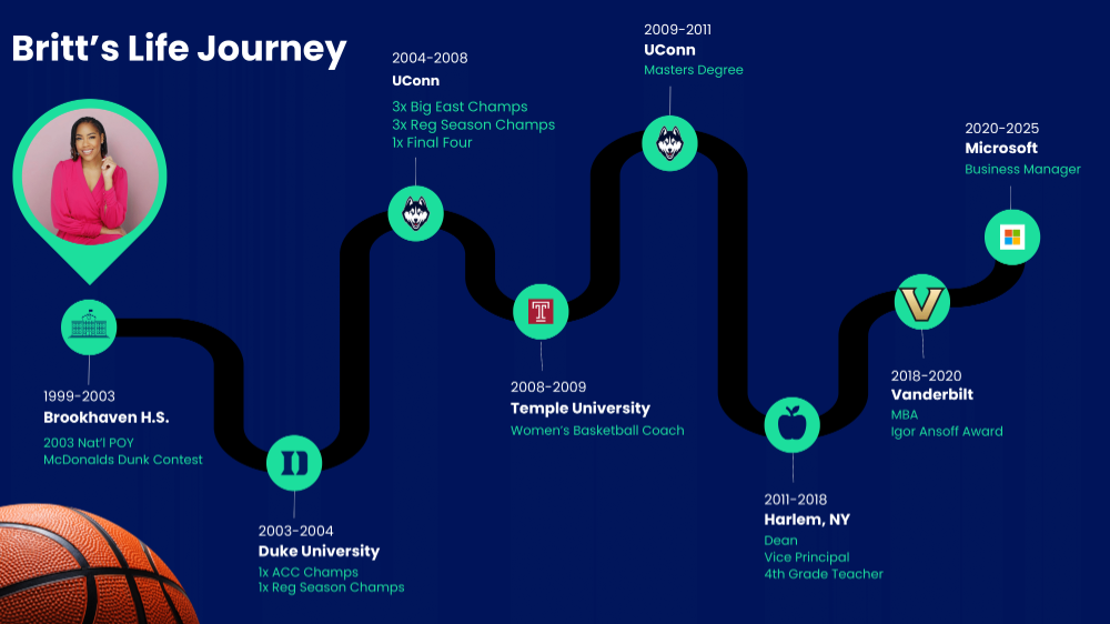 Britt is a leadership coach, speaker, and former #1 high school basketball prospect known for turning setbacks into lasting impact. After a career-ending injury at Duke, she went on to play at UConn, coach at Temple, earn two master’s degrees (including an MBA from Vanderbilt), lead students as an educator in Harlem, and drive transformation at Microsoft. Today, Britt leads Be The Exception Coaching, delivering keynotes, workshops, including her signature program: Own Your Adventure program, a series of interactive workshops and a companion workbook.
